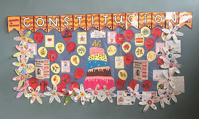 Buenos días, el pasado jueves día 5 trabajamos en las diferentes clases de E. Infantil y E. Primaria los derechos y deberes de la Constitución Española. Ese trabajo ha quedado reflejado después en un mural colectivo. Aquí os lo dejamos. Un saludo.